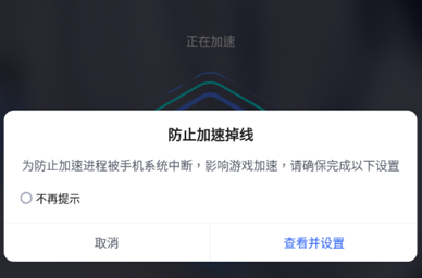 第一次进入加速界面的玩家会收到来自系统的提示,为了防止手机中断后台进程,点击“查看并设置”后,根据教程内容逐步完成相关设置即可。