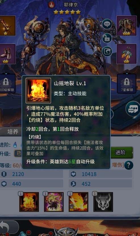 耶律京的一技能是【山摇地裂】,是耶律京的主动技能,该技能会引爆地心熔岩,攻击随机三名敌方单位,造成77%魔法伤害,40%的几率为敌方附加上【灼伤】状态(【灼伤】状态会让携带该状态的敌人单位在每回合损失【施法者攻击力×15%】的生命值,该效果可以叠加),可以持续两个回合。
