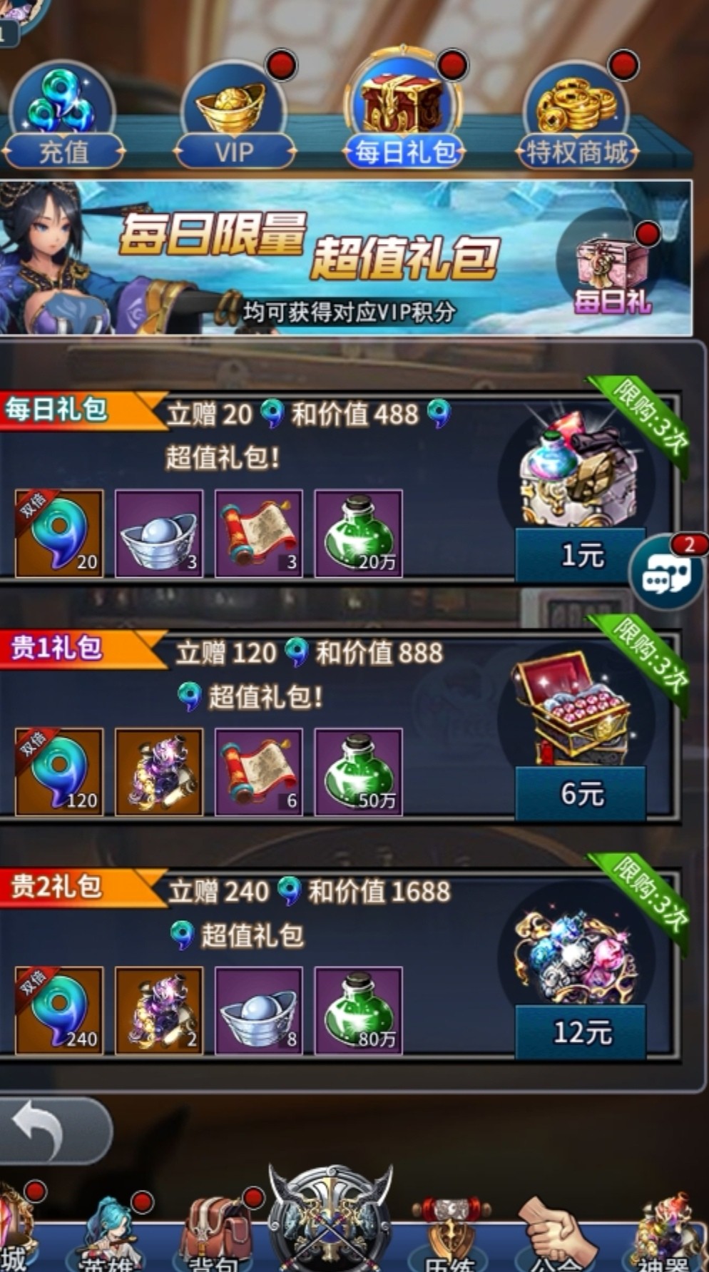 第九个【每日礼包】,玩家可以通过购买每日礼包,也就是氪金来获得,不过这个属于微氪,但是能一次性获得几十万的英雄经验,亟需经验来给英雄提升等级的玩家可以去尝试一下这个方法。