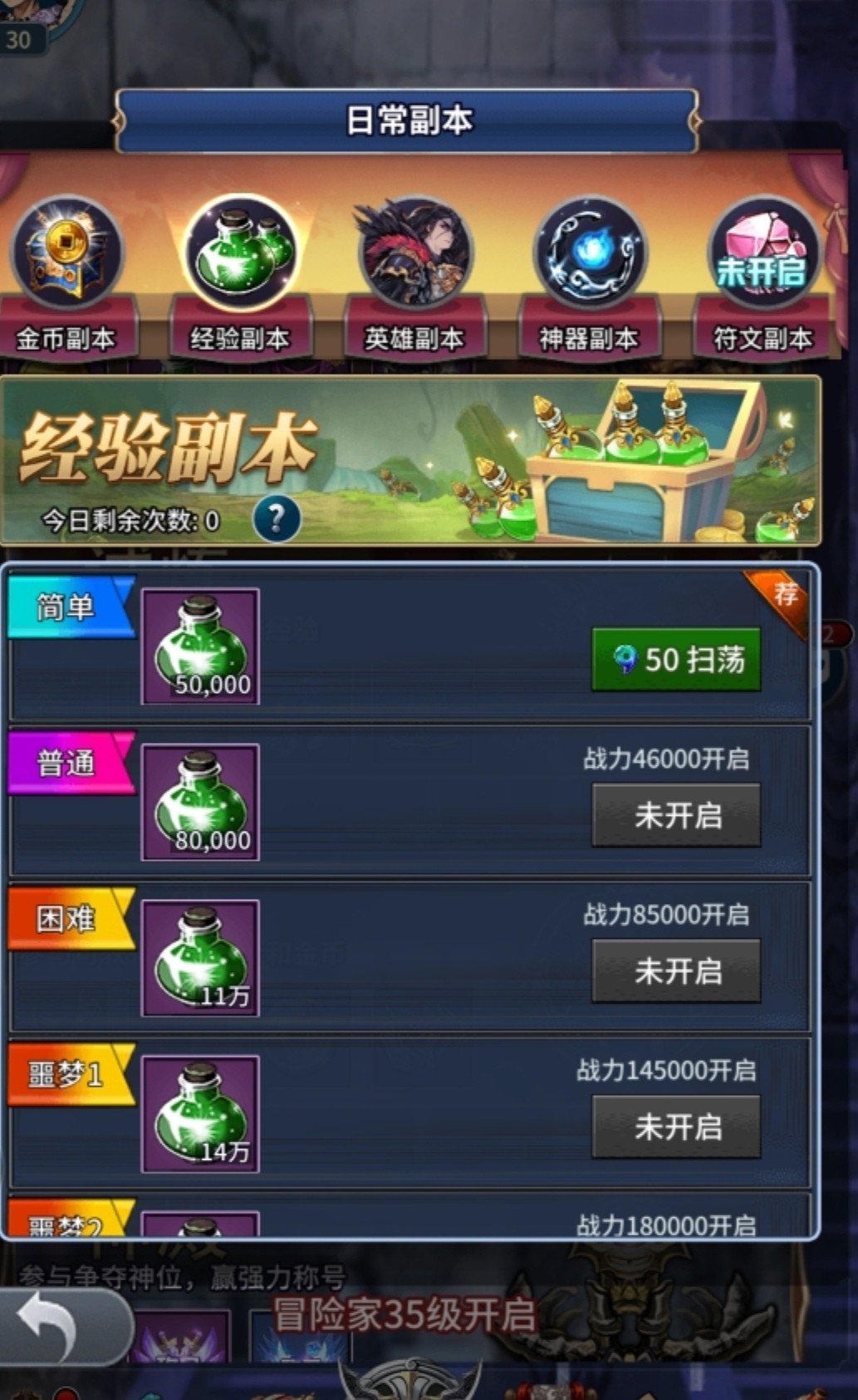 第二个【试炼挑战】,玩家前往试炼之门中进行试炼挑战,每次首通都会获得首通经验奖励,而后续的扫荡也可获得大量英雄经验。