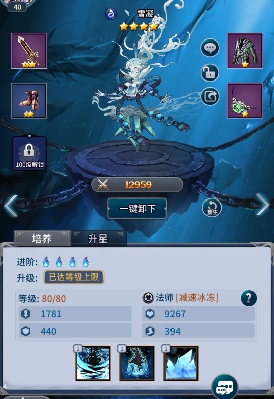 除此之外,雪凝她的初始星级只有四星级,因此玩家要给她进行升星,在升星之后,雪凝的战斗力,以及等级上限都会有所提高的,而且还能解锁符文装备功能,刚好雪凝的速度属性是比较弱的,而想要提升她的速度属性就只能够将雪凝的星级提升后解锁符文功能,通过装备速度符文来提升。