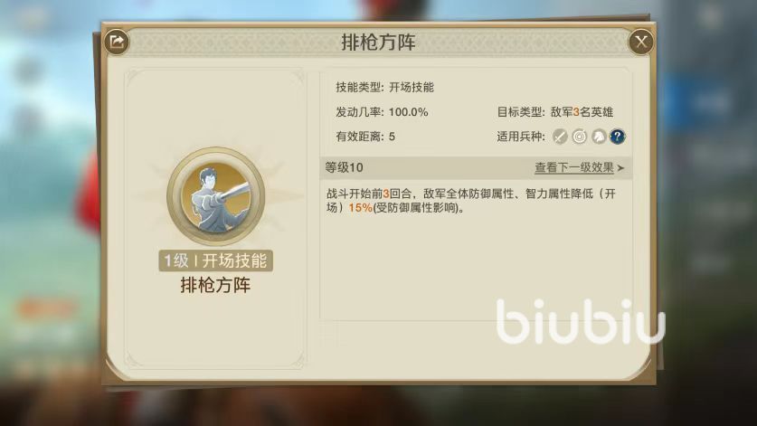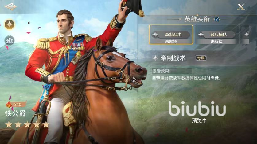 在头衔和选择方面,一共有5个头衔可以选择,其中专属的是牵制战术和散兵横队,也是最值得选择的两个。牵制战术可以使自带技能排枪方阵增加额外效果,降低敌方敏捷属性,效果非常出色的buff类被动。本身排枪方阵自带技能就可以降低智力和防御,现在有了敏捷,可以更加全面的削弱对方,也能够突出自己敏捷属性上的优势。