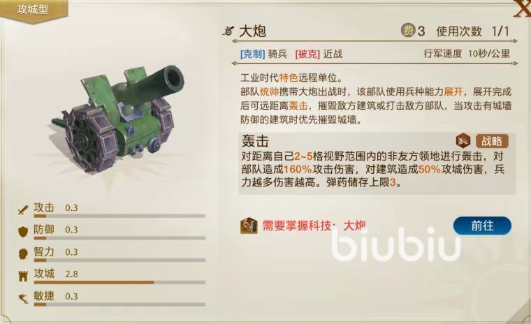 该时代还拥有功能非常强大的大炮,部队统帅携带大炮出战时,可以完成远距离攻击摧毁对方的建筑或者是打击敌方部队。攻击有城墙的防御建筑时,优先摧毁城墙,是攻城中不可缺少的重型武器。兵力越多伤害越高,弹药储存上限为3。该时代还拥有骑兵,但是兵种已经变成了坦克,拥有大炮的火力和骑兵机动性,设计出来的目的就是为了突破密集防御的阵地,面对机枪、铁丝网或者是战壕都无所畏惧,无论对方步兵冲锋还是骑兵冲锋,遇到坦克后都将伤亡惨重。