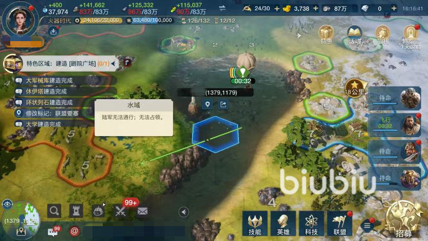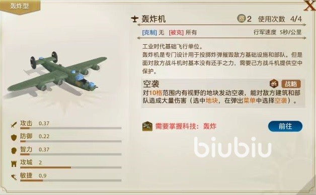 接下来就是两种重磅的空中战斗单位,战斗机和轰炸机,这是达到工业时代后才能获取的飞行兵种,解锁了轰炸机和战斗机后,才是真正空战的开启。轰炸机是专门为了投掷炸弹摧毁地方部队和基础设施而设计,缺点是面对对方战斗机没有还手之力,需要提供空中保护。它的空袭可以对10格范围内的地块发动空袭,无论是建筑还是部队都将承受大量伤害。