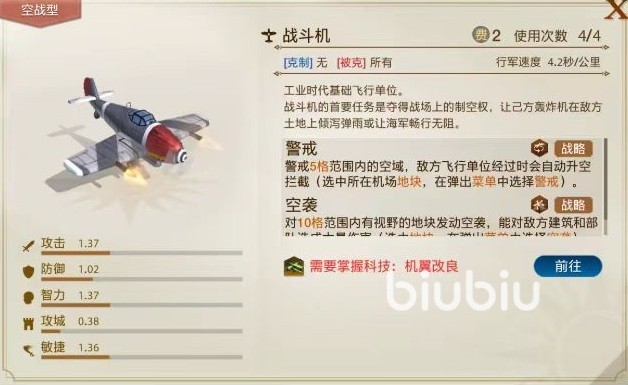 战斗机的主要任务是夺取制空权,让敌方轰炸机能够在对方土地中疯狂轰炸,它具有警戒和空袭的两个效果。在进行警戒时,敌方飞行单位经过会自动升空进行拦截,空袭是对10格范围内的地块发动攻击,也具有一定的对地攻击能力。综合来看,战斗机是比较全能的单位,而且轰炸机一般不会单独出动,两者需要配合起来,但战斗机可以独自执行任务。大家在解锁时候可以优先将机翼改良科技掌握,这样先出来战斗机会更有优势。