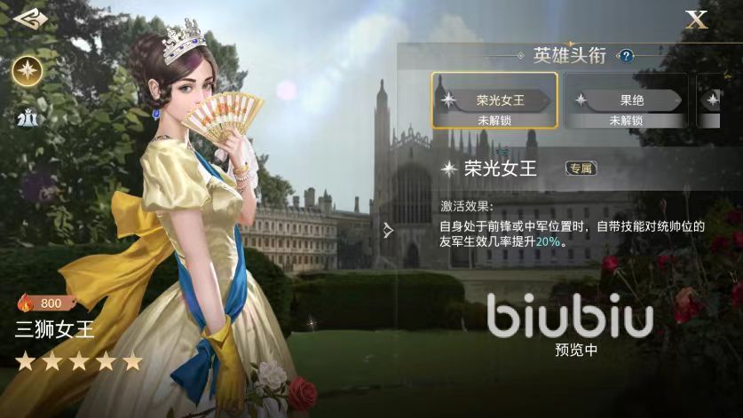 在女王威仪卡池中,所出现的t0角色就是仁德公,t1角色包括三狮女王、铁公爵、雄狮王、铁锤查理,T2档次为库比、镰仓战神、吉加美士和海丝公主。先来看一下目前公认的t0角色仁德公,它的原型就是大家所熟悉的刘备,自带技能仁德之君,为我方提供伤害提升和恢复兵力等状态。可以使我方受到非常高的治疗效果,理想阵容就是和龙将以及枭雄一起组成,利用枭雄的自带技能提升龙将伤害,依靠龙将输出打掉对面。