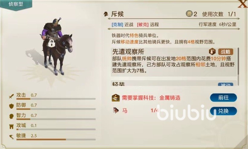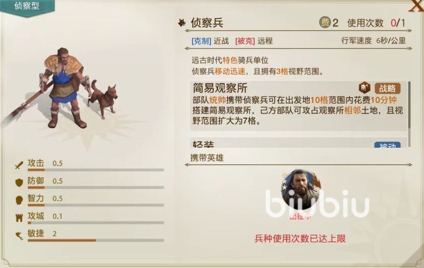 接下来是培养一些侦察兵种,他们是势力扩展的先锋,在最初的远古时期就拥有侦察兵。作用是在阵容里指挥官携带侦察兵时,能够在出发点10格范围内消耗10分钟来搭建简易的观察所,通过观察相邻土地,扩大视野范围。因为获得世界需要一个个的占领土地,有了侦察兵以后就会非常方便。