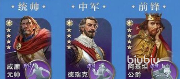 不列颠文明可以选择威廉元帅、德瑞克和阿基坦公爵组成一个阵容,威廉元帅能通过技能打出非常可观的群体伤害,德瑞克作为前方的坦克可以将技能受到的伤害进行累计,并有概率回复我方的兵力,阿基坦公爵的主动技能可以嘲讽敌人,并触发德瑞克的治疗效果,每回合还有一定概率帮助队友分摊掉伤害,更好的保护威廉元帅这个主要输出。