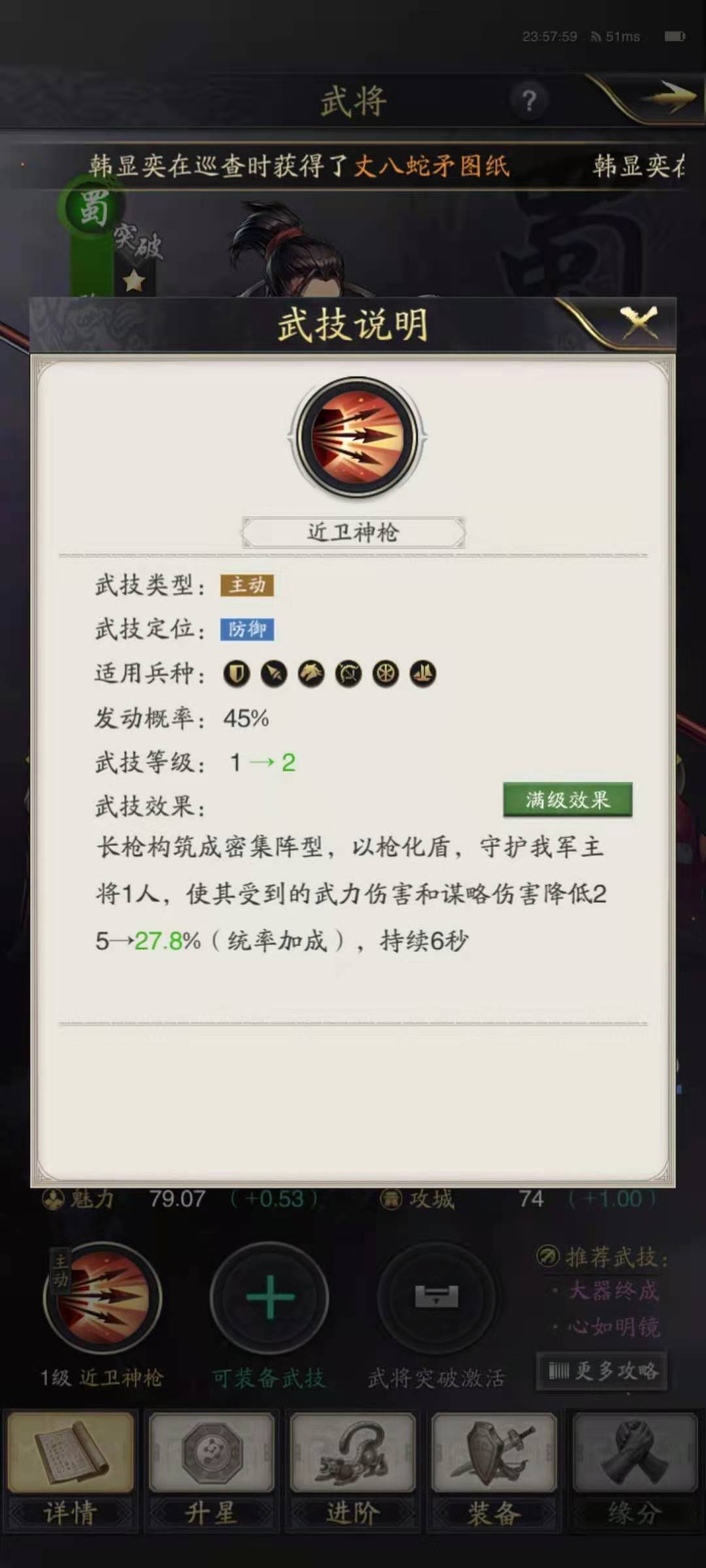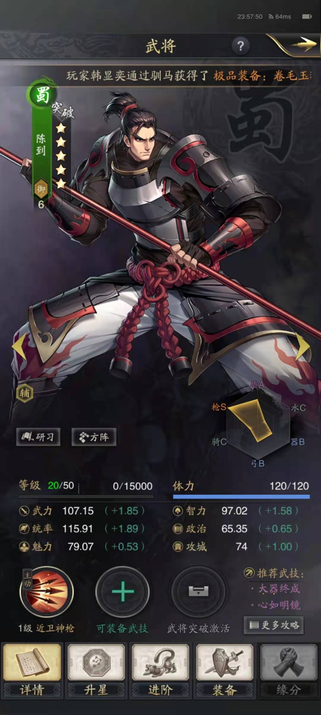 先来看一下陈到的基础属性,陈到属于蜀国阵营,上阵需要的统御值是6点,也是比较高的一些了,自身的初始武力值是72点,成长是1.85点,初始统率值是80点,成长是1.89点。作为一名武力武将,陈到的武力属性确实不高,比主流武将要低一些,但是统率值还可以,用于防御上是没问题的。