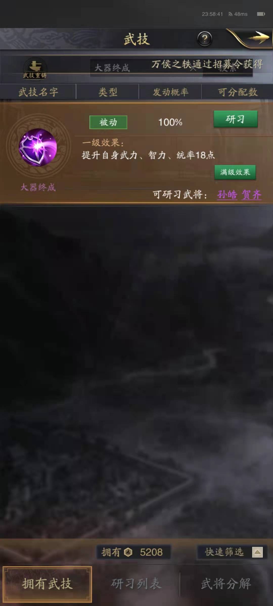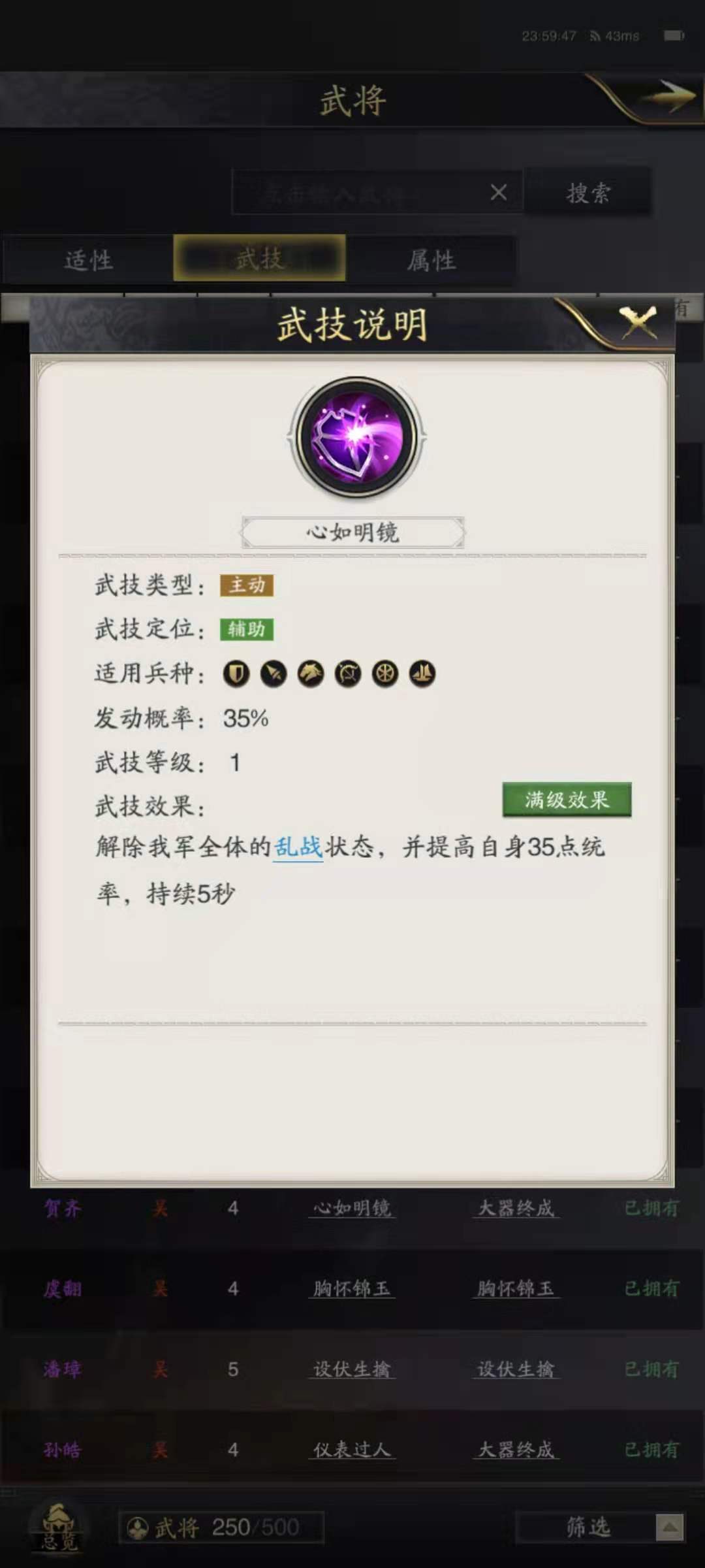 陈到不推荐进入主力队里,但是在辅助队伍里确实不错的选择,利用自身战法的防御特性,对主将提供最周密的防护,在对抗一下以斩首为战法的敌人的时候,可以起到不错的作用。例如在对抗公孙瓒的白马齐射技能时,很多主将都撑不住集火,但是在有陈到的时候,提供的防御效果就能稳住主将的血量,防止被斩首。大家可以在遇到这种敌人时,就把陈到换上去,打过了再换下来,陈到选择大器终成和心如名镜这两个辅助技能就可以了。
