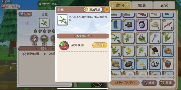 除了牧草之外,游戏中还有一个比较重要的道具素材叫做甘草。甘草是用来制作草木灰的重要材料,而草木灰又是合成制作肥料的必需材料。甘草不能够通过种植获取,只有野外或者是家园的空地才可以采集到甘草,当然了商店里还是有卖的。如果大家背包中有甘草的话,可以点开甘草的详情,然后点击采集获得右侧的前往按键来利用精灵进行资源的自动寻路,这样比我们自己去找甘草的效率要高很多。