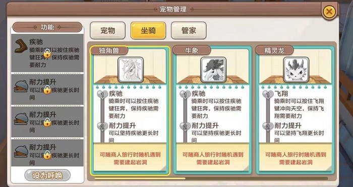 在游戏的初期我们获得了第一个动物,也就是跟随在我们身边的小狗。其实小狗只是游戏种众多动物中的一个。四季物语游戏的动物分为三个种类,分别是宠物、坐骑以及管家。在获得新动物之后我们直接在动物的管理页面就可以选择跟随在我们身边的动物了。