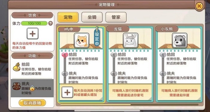 宠物最大的作用就是帮助我们捡起采集或者是收割过程中掉落的物品。在目前版本的游戏中,宠物有默认的小狗、龙猫、小灰熊、家猫、犬神、小香猪这几种,玩家们在游戏世界中探索有几率会遇到新的宠物,当然了,也可以通过建造迷你豪宅的方式来获取新的宠物。除了拾取掉落物品外,宠物也可以帮助我们承担一部分的道具存放。