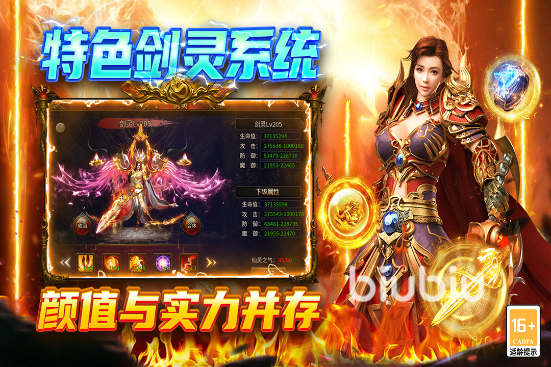 玩家击杀怪物可以爆灵符、充值卡等道具,真正做到了零氪逆袭,首爆奖励也不限量人人都可以参与,而不是少数高战玩家的独享资源。它的成长体系也很丰富,有特色剑灵系统能免费获取,配合上线就送的各种神技,例如开天斩、逐日剑法等等,大大提升了前期的刷怪效率。