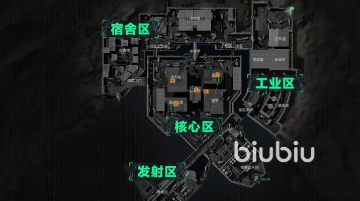 航天基地核心区的资源最为集中且丰富,除去门卡房间外,主建筑包含92个固定物资点。靠近该区域的时候要处理掉顶上的狙击兵,需要注意的是这片区域是出于信号屏蔽范围内,要紧跟队友避免丢失迷路。该区域一共有五处,东南边的“黑室”,正门进左右两侧通向内部,左侧的楼梯可以去二楼的指挥室、四楼的总裁室。黑室有3个储物箱和1个小 的保险箱以及其他十来个物资点。