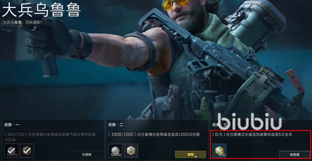 任务1和任务2还是蛮简单的,这两个可以一并完成,喷气背包累计超过100米,按V键使用喷气背包,然后使用武器造成足够多的伤害就可以完成这两个任务。就是这个任务3要在威龙加速期间完成5次击杀稍微有点难度。