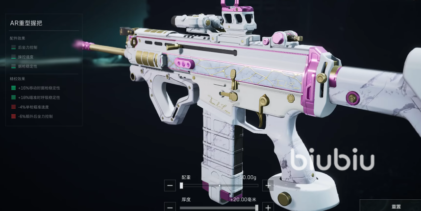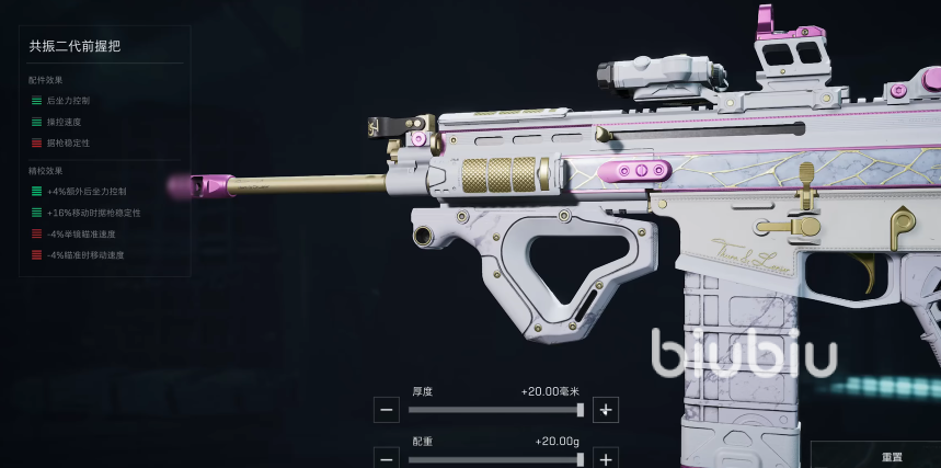 枪管采用“实用长枪管”,精校配重和长度都向右拉满;共振二代前握把,精校将配重向右拉满;如果对这把枪当前的开速度可以接受的话,也可以将厚度也向右拉满。弹匣用30发的,还有快拔套(灰熊全威力),幻影后握把,后握把的精校也是将配重和厚度向右拉满。
