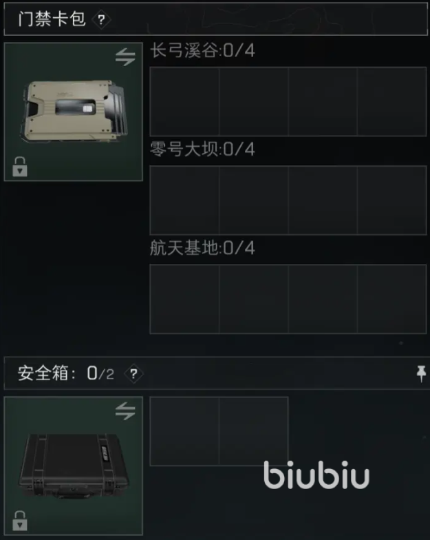 除了常用的装具外,还有几个特殊的装具,例如:门禁卡包、安全箱。门禁卡包是放一些门卡钥匙的,安全箱则是放武器配件之外的物品,这些东西即便撤离失败了也不会损失。所以,当在地图上搜刮到好东西的时候,可以第一时间放到里面去。