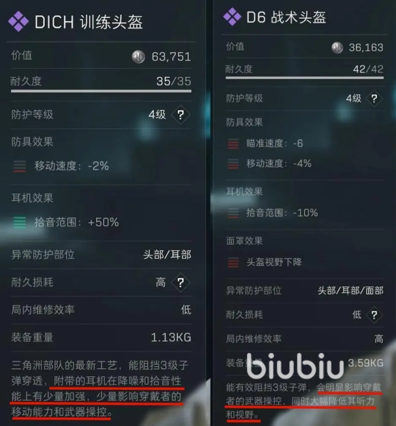 主要是头盔与护甲,护甲分为不同的防护等级,自然是越高对子弹的防护的效果越好。同等级下的护甲也是有不同样式的,有防护面积小耐久低的轻甲,也有防护面积大耐久高的重甲。不过即便是再高级的护甲也防不了所有的部位,例如手臂、腿。头盔可以抵挡致命伤害,而且不同的头盔对于视觉、听觉也是有影响的。战斗中,如果子弹命中没有防护的区域会打出晕眩,进而视觉上也会有影响。在新手阶段主要是看目标危险程度来选不同价格、类型、等级的防具。