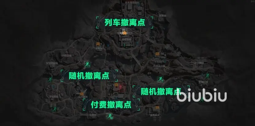 目前这张地图上有八个撤离点,有常规的撤离点,也有满足条件之后才能使用的特殊撤离点。目前有4个常规撤离点,2个概率撤离点,1个付费撤离点,还有1个列车撤离点。不同撤离点的使用方式以及所需满足的条件不同。