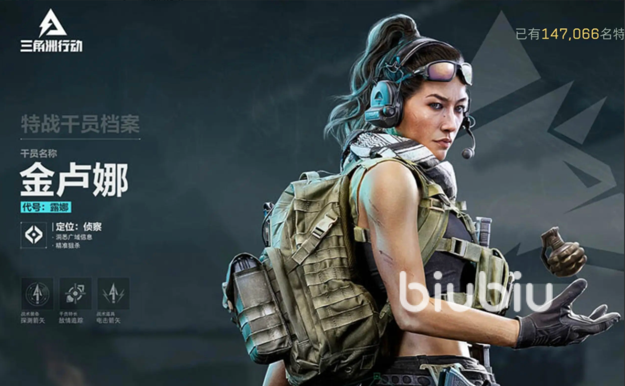 这个角色的定位主要是用来突击的,同时在游戏中人气也非常的高,角色的被动技能是在开镜的时候速度比别人更快,特长的技能是滑铲,战术的道具有两个分别是三联手炮和烟雾弹,烟雾弹可以帮助角色短时间快速走位,而三联手炮不仅可以击倒敌人还可以将敌人的载具给摧毁。