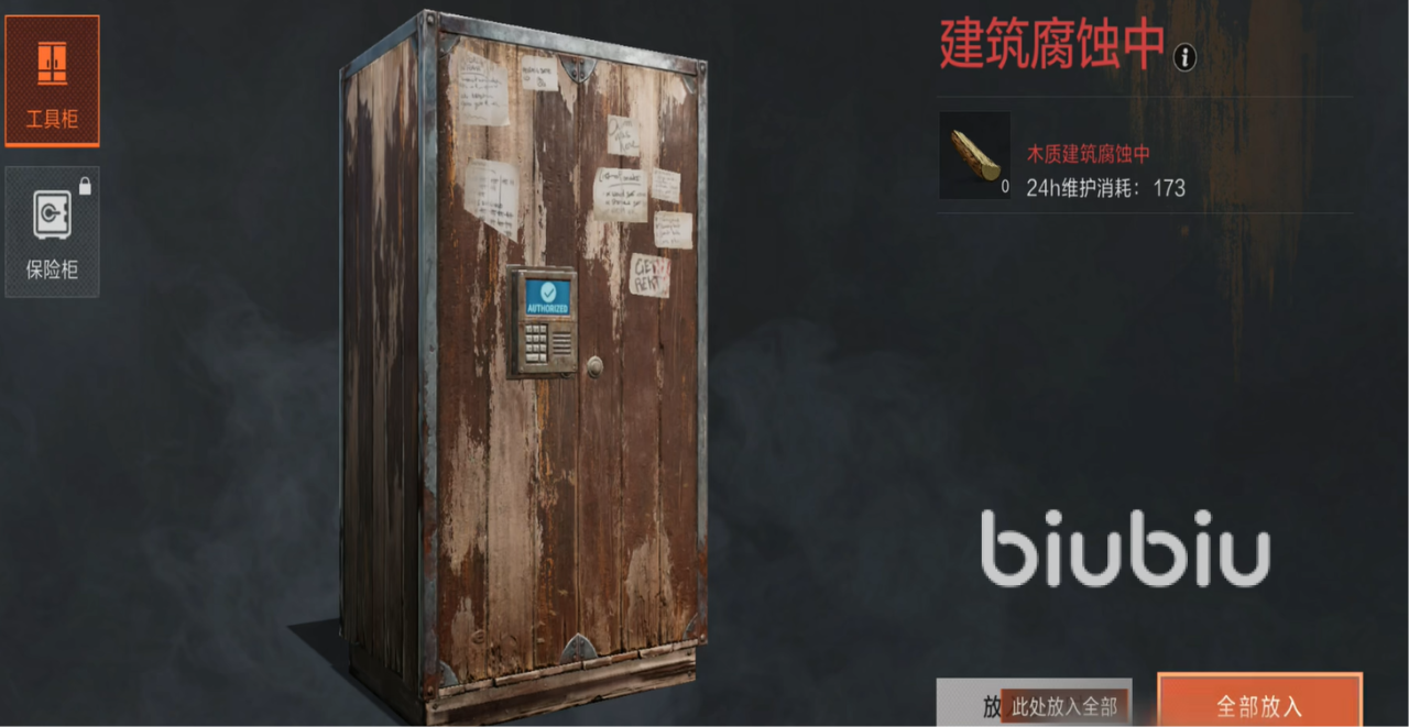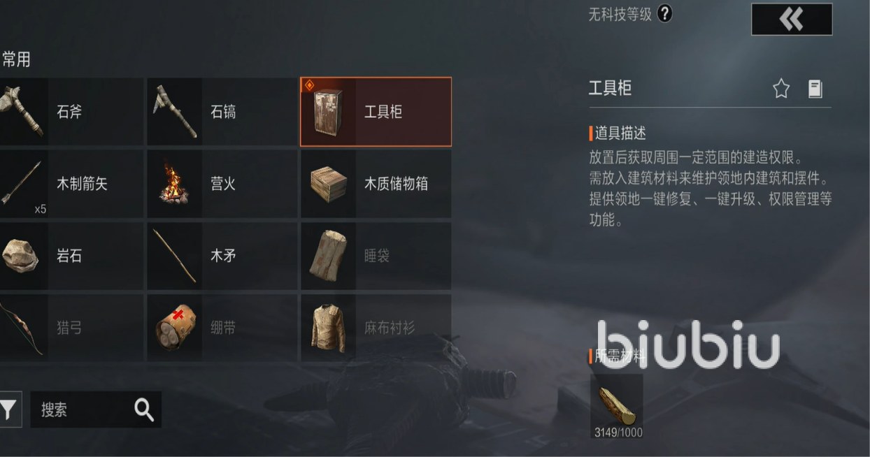 想要获得工具柜的话,大家就可以直接点击游戏主页左下角制作。其实就可以在常用里到第三个位置找到工具柜,放置之后就可以获得领地中一定的建造权限。内部的建筑以及各种摆件都需要进行维护,然后就可以将所拥有的材料放入工具柜,即可自动维护大家的领地。