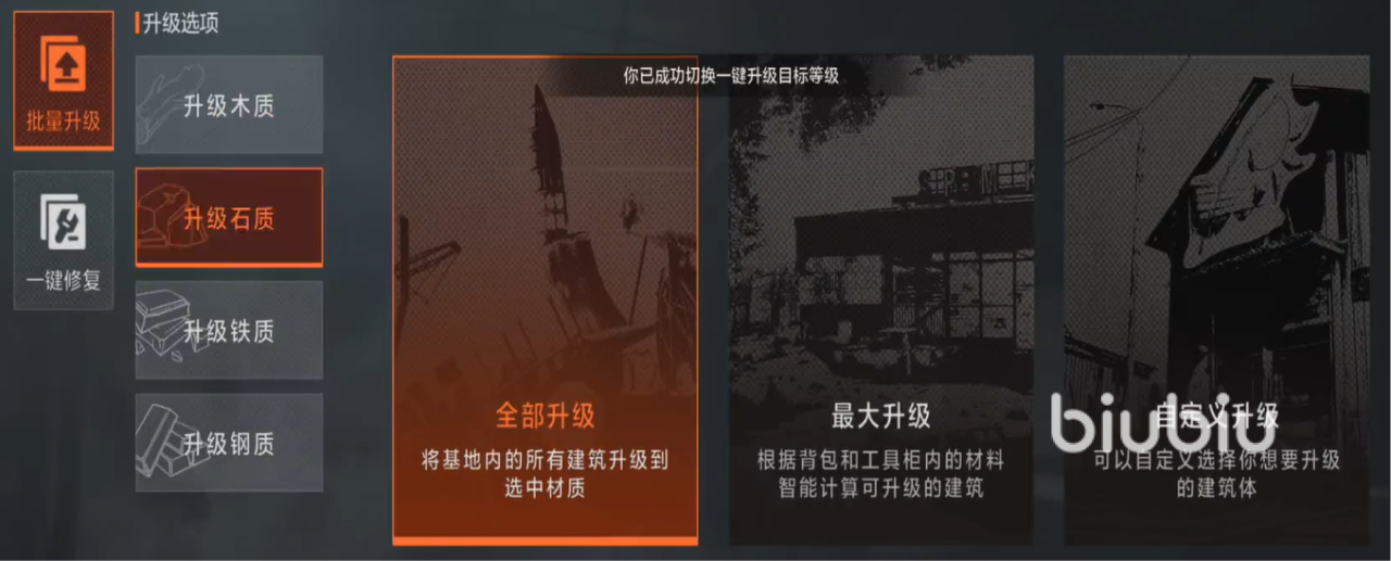大家可以点击最大升级,这是就会根据你所拥有的材料数量进行智能计算,并且直接将其升级完毕。第三个的话就是可以自由选择自己想要升级的某个建筑部位,下面这几个就简单了,就是对应着不同材料的建筑物,分别是石质、铁质、钢质。