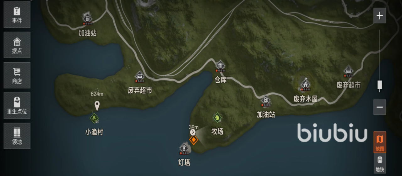 刚开始大家会随机出现在一个海边里面,打开地图之后就可以发现大家位于海边的灯塔。再往上走的话就是牧场,然后附近有公路。公路旁边是各种设施,例如仓库加油站和废弃木屋。再往远看的话还有其他的建筑以及村落,不过这只是该地图的1/12左右。
