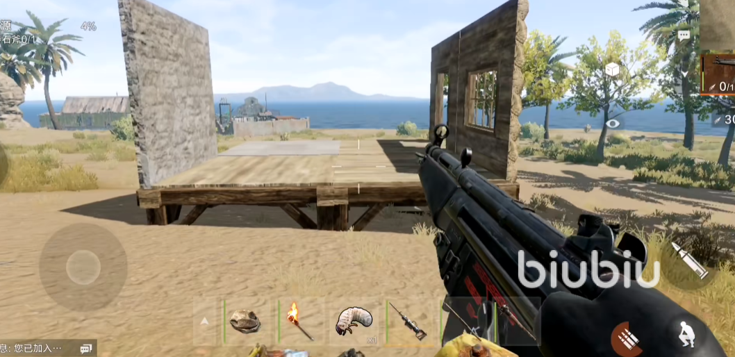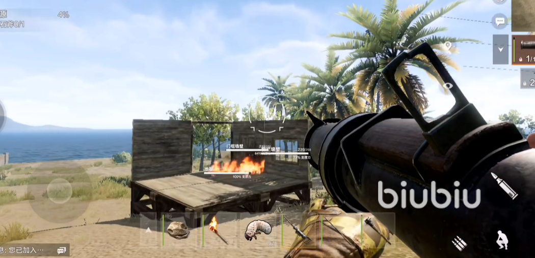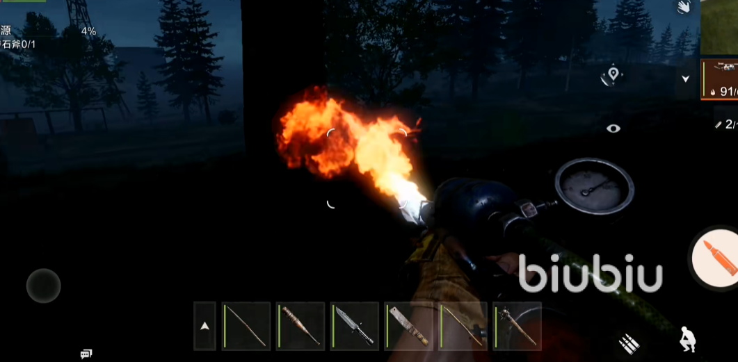 弩箭是比较常规的武器,换弹的速度稍微有点慢。渔枪是只能在水里去使用的武器,开荒时期不是非必要去捡的。还有一把火焰喷射器,使用燃油,能对敌人造成范围伤害,旁边即使没有草,也可以被点燃,木质的建筑物也是可以的。