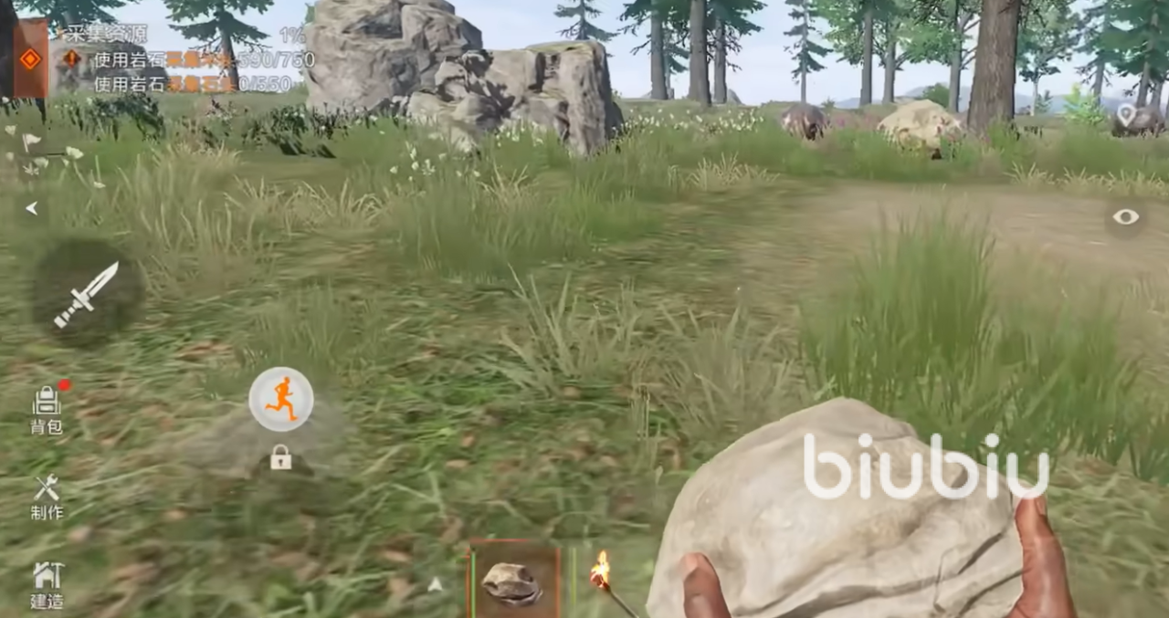 开局刚进入游戏时,大家只有一双空手,而生存的第一步就是收集基础资源。这时可选择拿起拳头敲击树木(瞄准红点可提高效率),制作石斧后砍伐更快。然后还可在地面或矿脉处拾取石头,用于制作石镐、武器和建筑、木屋等。