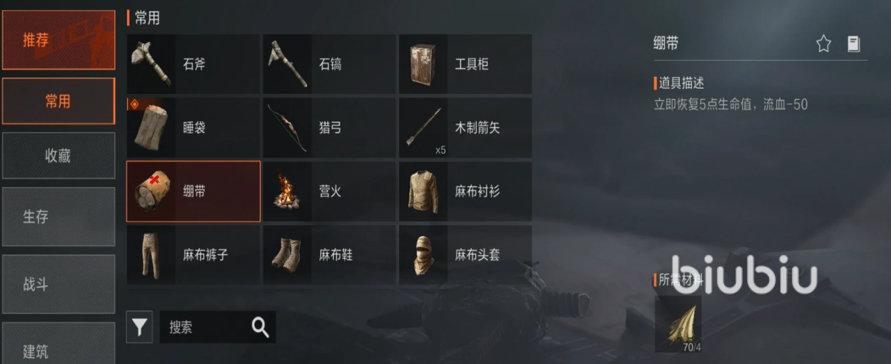 绷带在游戏中的作用是让大家在野外探索受伤时进行使用的,能够提高玩家的生存能力,比如受伤可以及时的回血,避免持续掉血的情况,其他的当然除了绷带之外,一些其他的恢复工具也建议大家可以多收集合成一点,防患于未然。