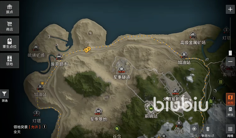 物资车物资是非常丰富的,甚至有小伙伴开出过火箭筒和C4,还是值得大家前去寻找的。车会在服务器的第三天出现,大家要注意一下这个时间,在地图上会按照标注的黄色路线行驶,不过大家要注意的是目前的车分为两种,分别是物资车和巡逻车,物资车周围没有人守护,且也不会主动攻击,而巡逻车周围会有一圈蓝色的小人,顶部还有炮台,需要大家远程输出,这里要注意的是如果将蓝色小人都打完,那么车不会停止前进,若是蓝色小人没有被打完,那么打一下车就会直接停止。