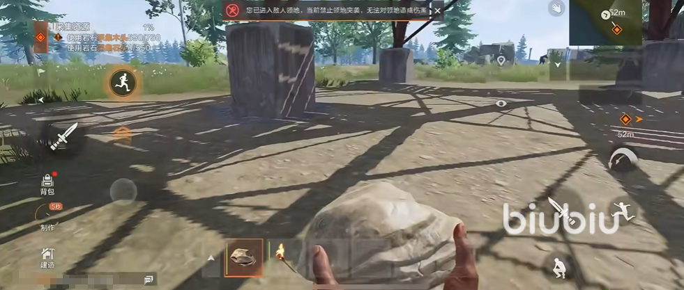 在游戏中小伙伴们会随机刷新在一些区域,前期要利用手里的道具快速的积攒物资,比如石材,木头以及相关的食物和水源。建立自己的基地时,尽量选择一些较为安全的区域,新手可以考虑在绿色区,或者一些峡谷内这样方便撤离和逃跑以及隐蔽身形。