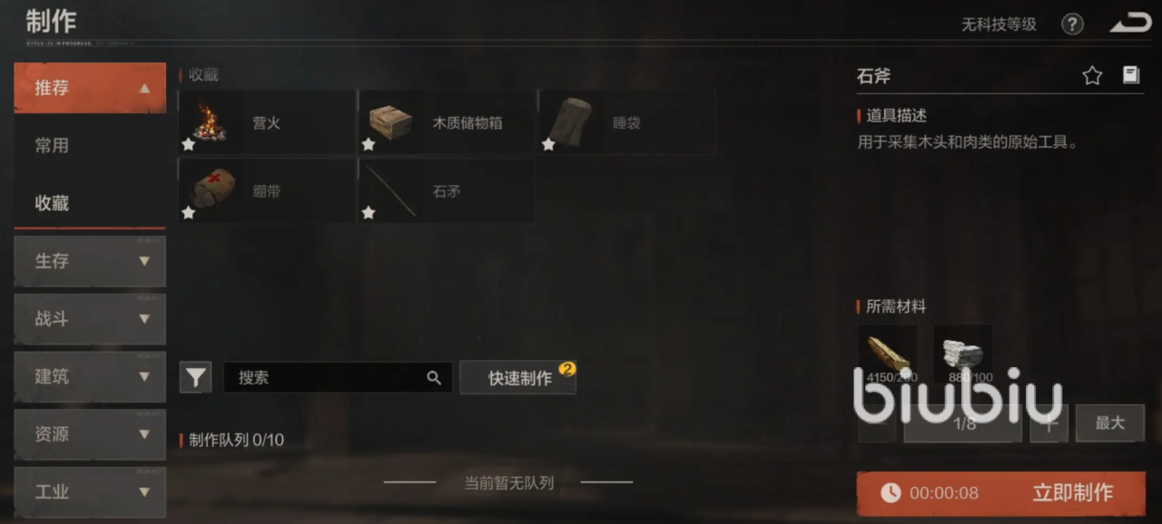 记得采集时尽量往标记处打,石头则是闪光处,击打标记处能帮助更容易快速的获取,收集好一定后可以先把石矛睡袋做了,另外还有绷带和石矛,接着看一下自己附近的低阶据点,拿好武器过去。