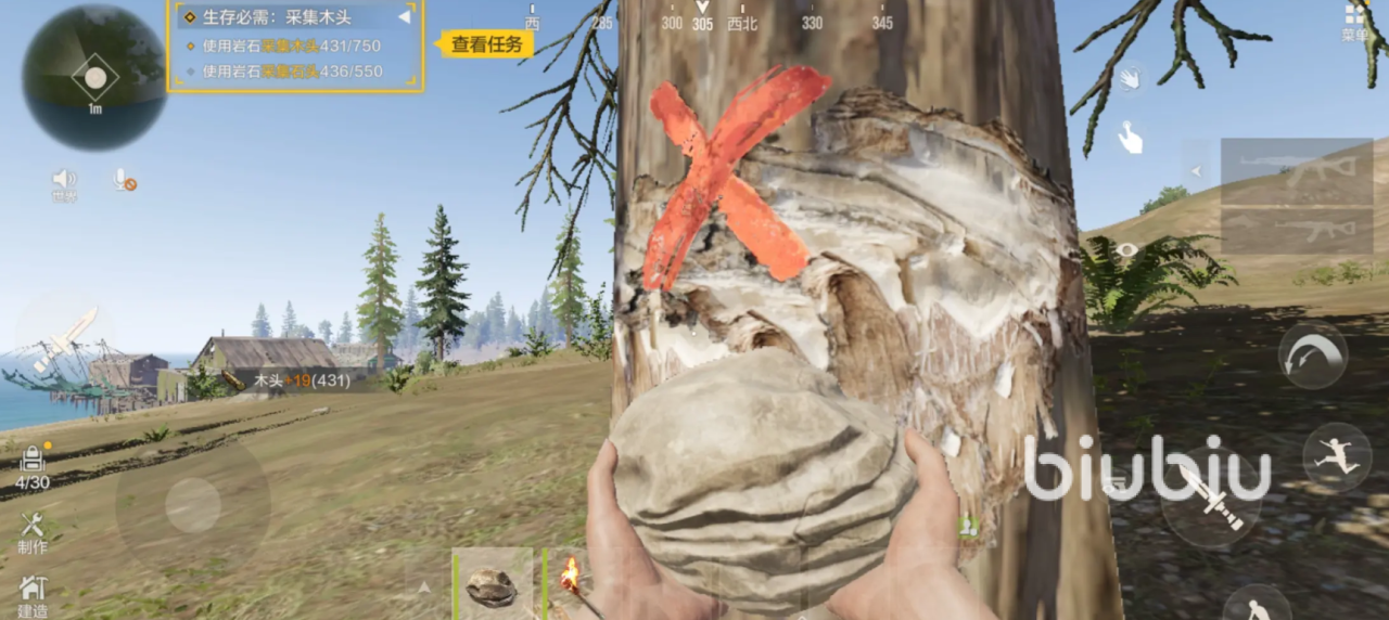 新手登岛首先会有一定时长的保护时间,大家要做的第一件事就是打开左上角的地图,找到绿色或者土色的地方寻找物资,若是在雪地等地出生更是要赶紧跑,不然非常容易死,抵达资源地后跟着任务需求来采集木头等基础物资。