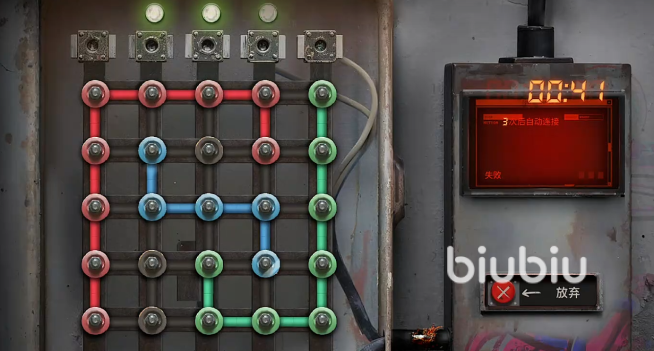 右拐后往前面走,就能进入到绿卡房之中,直接在房间里找闸点,这个闸点如果想要通过需要大家完成一个小游戏,那就是在指定时间之内把颜色相同的点给连接成线,完成后就能拿到蓝卡。