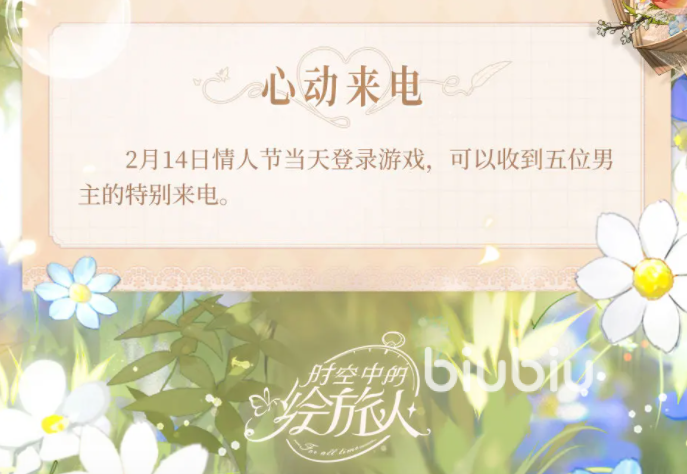 总的来说时空中的绘旅人情人节活动内容还是比较多的,因此玩家一定要守时登录游戏,获取游戏赠送的各种丰厚奖励,情人节当天登录游戏奖励更多,小伙伴们一定不要忘记,还有心动电话等你来接听哦!