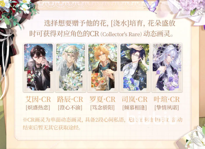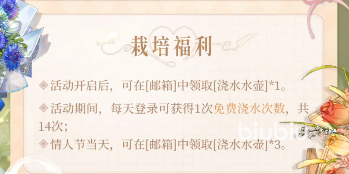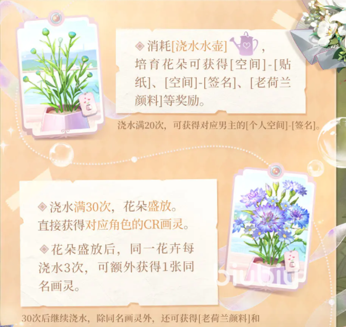 活动内容中还包括玩家使用水壶为花朵浇水,一共能够浇满三十次就能够获得玩家选择的角色的最新cr画灵,并且玩家一直保持浇水还会获得各种官方赠送的道具,奖励非常丰富就等玩家更新上线。