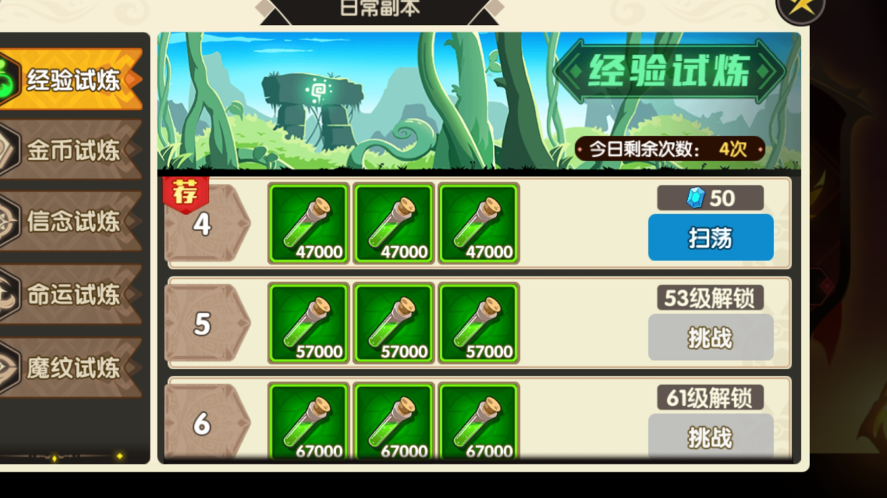 但是一天只有两次的时间限制,如果英雄药水实在不够,玩家是可以花费宝石去参加这种试炼的,宝石虽然珍贵,但是在这款游戏当中是可以通过过兵斩将活动取获得了一天白嫖的宝石,也开始可以达到几百的,以如果玩家去追求快速升级的话,就不要去吝啬宝石,去试炼中去购买这种经验药水。