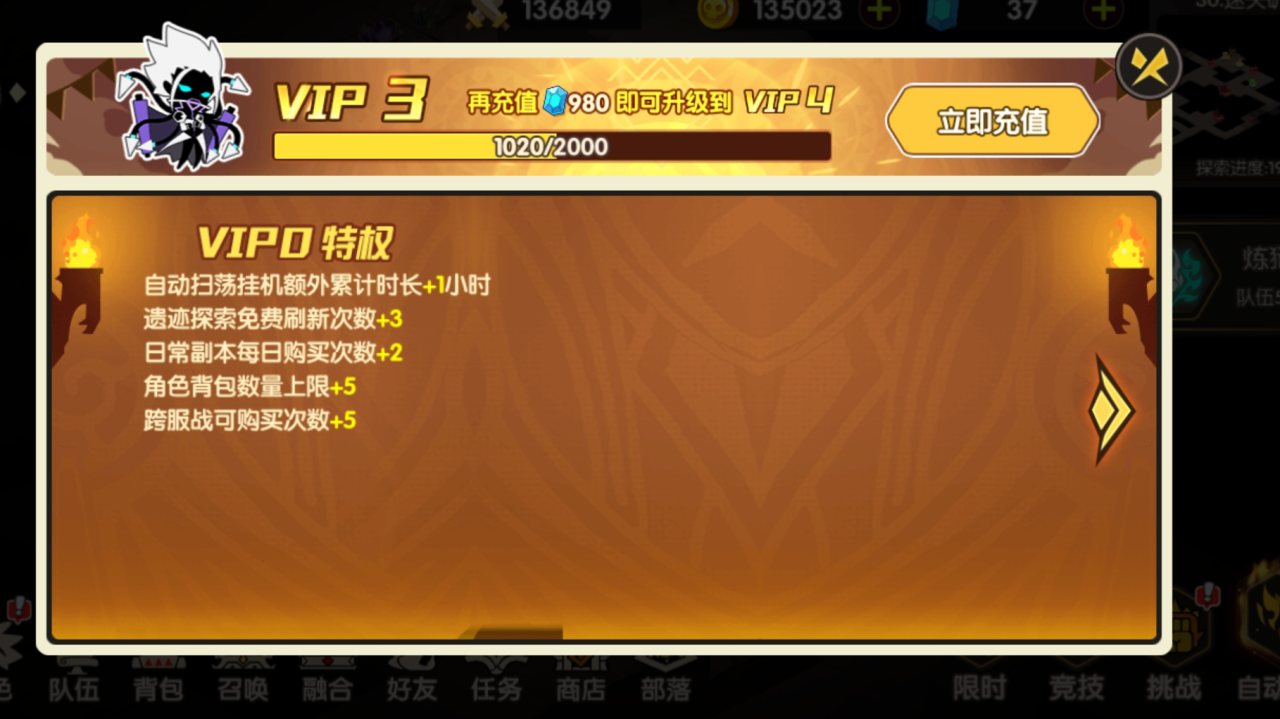 一般来说,玩家初始的vip等级是零级的,但是零级的vip也可以领取vip的福利,那就是一些紫色的英雄碎片,还有一些经验,药水这么一小点,奖励虽然算不上什么,但是积少成多,滴水石穿也会让玩家培养出一个很强大的英雄的。而随着VIP等级的提高,那么玩家获得的福利将会更多了。要VIP的等级,提高玩家的扫荡次数,变得增加了,并且每天可以挑战天梯的次数,也会随之增加每天跨服挑战的次数,也会增多,那么两三次。