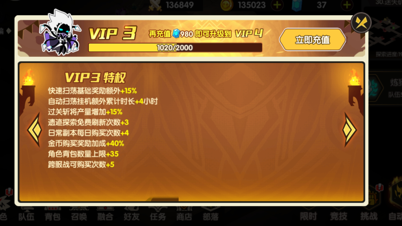 并且VIP等级高的玩家挂机获得的经验,材料以及奖励将会更加丰厚。虽然VIP等级不起来的玩家依然可以将这款游戏玩的很好,但是VIP等级高的玩家往往会更加有优势的。并且随着VIP等级的提高,玩家每天领取的福利也会更加的丰厚。
