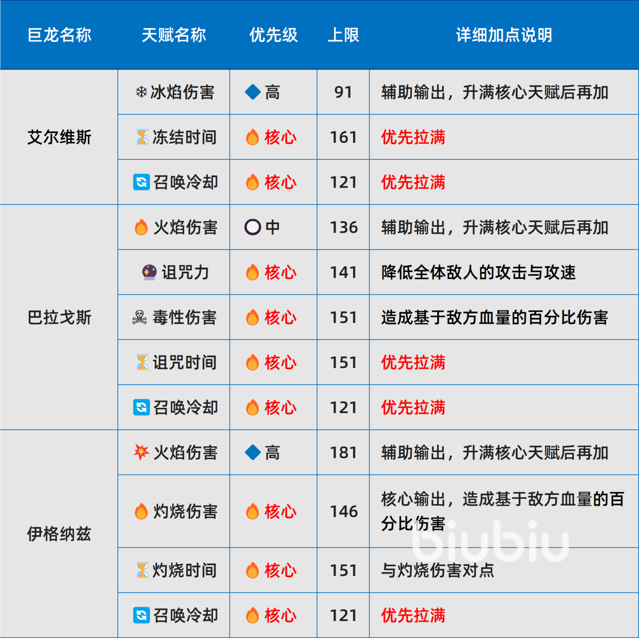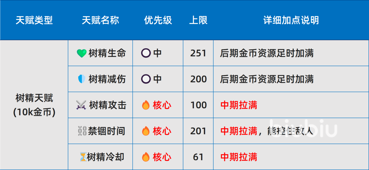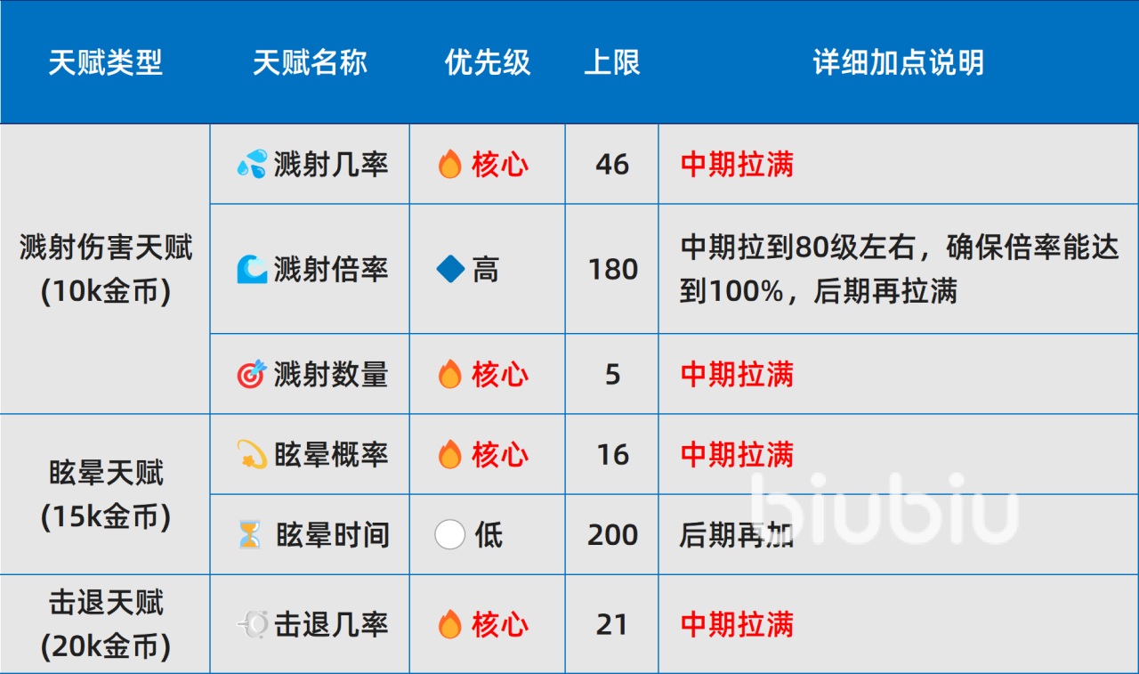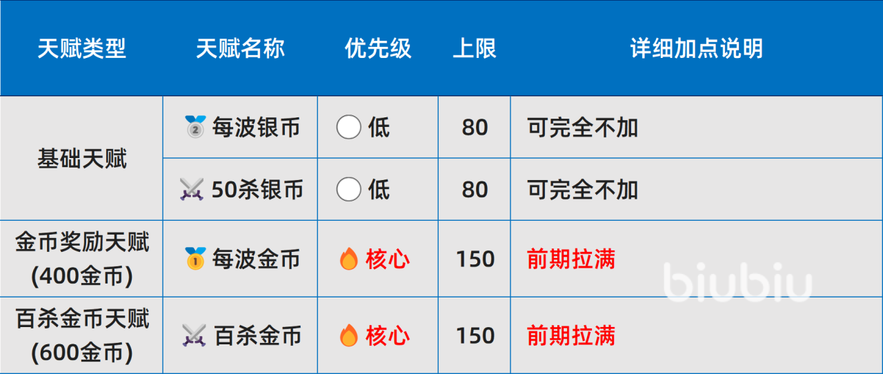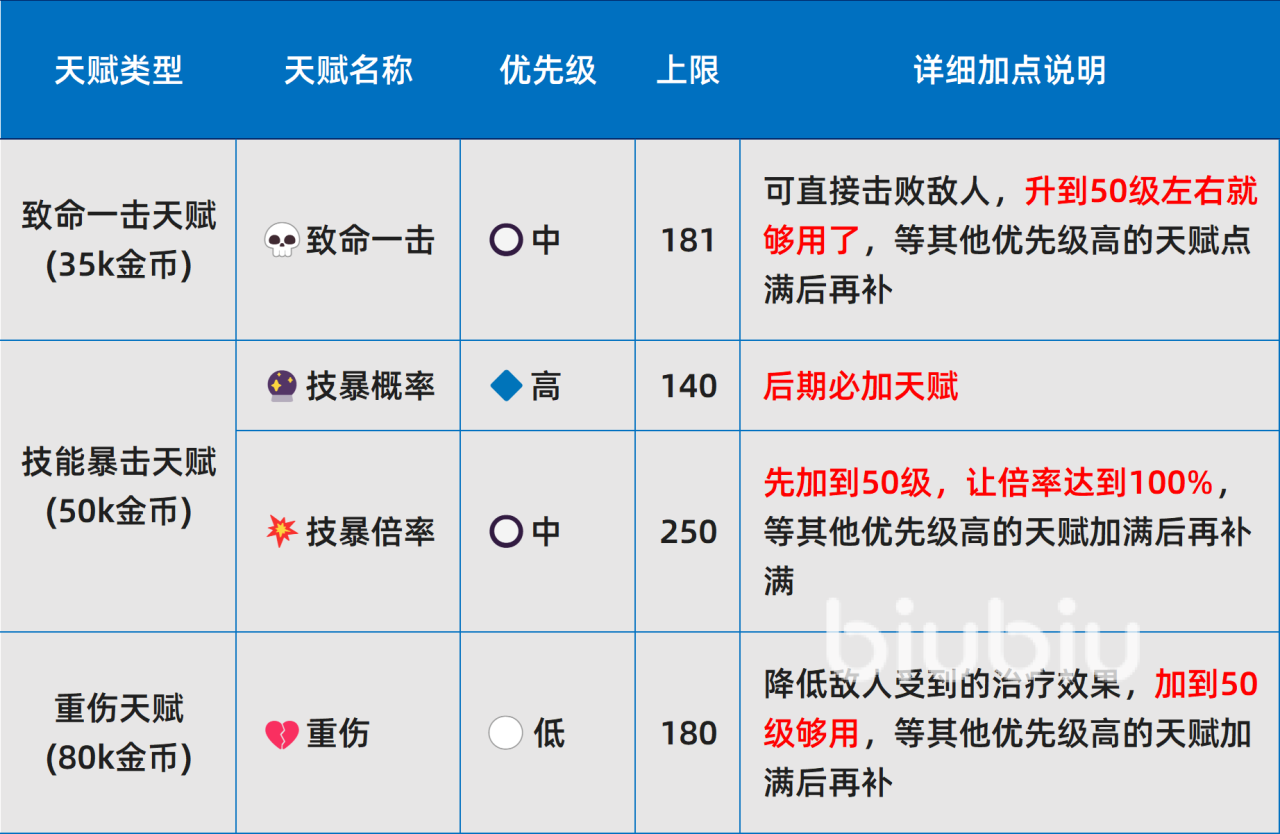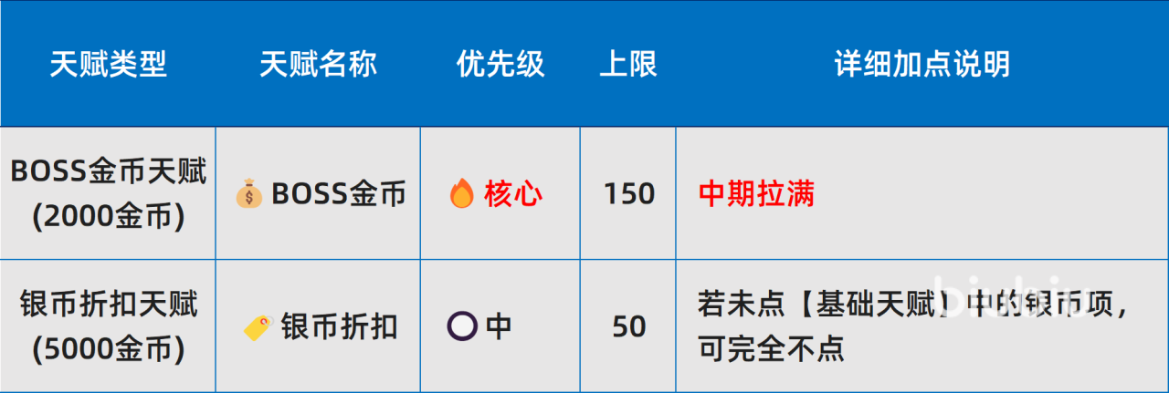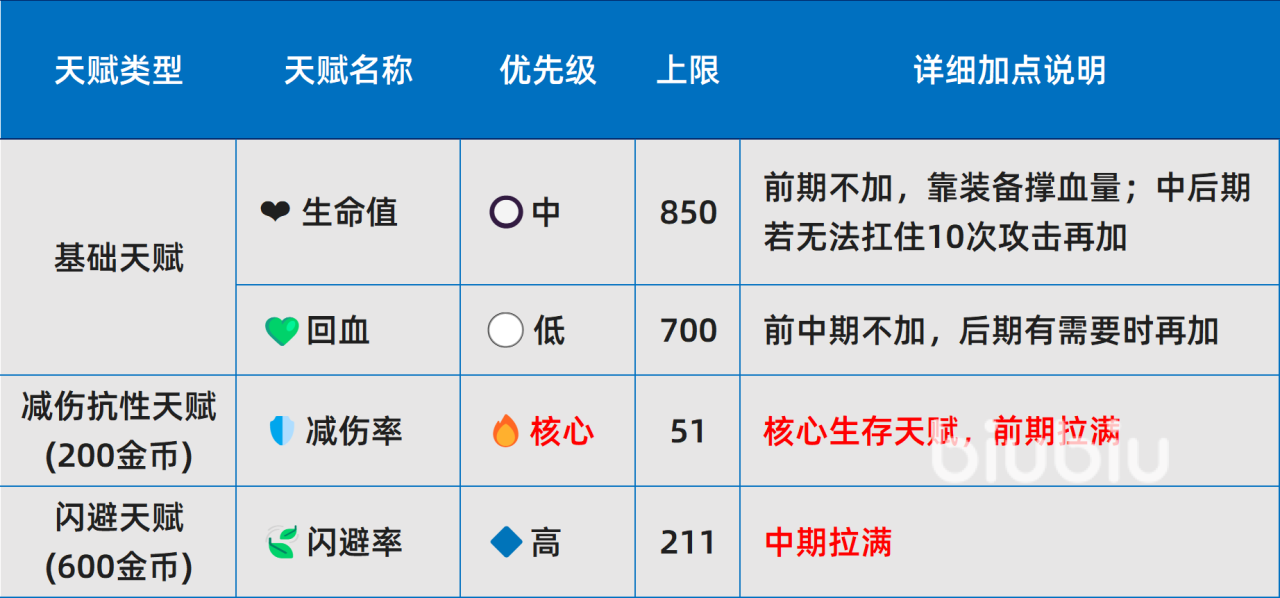 l 天赋优先级从高到低为核心>高>中>低,核心天赋在金币资源足够时优先拉满。