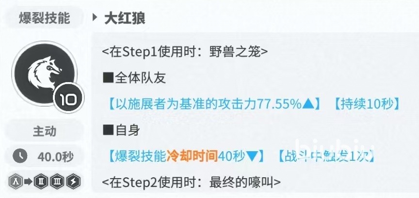大红狼这三种效果对应着三个爆裂阶段,爆裂1可以生效野兽之笼,提高全体队友攻击力。自身爆裂技能冷却时间降低。爆裂2使用最终的嚎叫,挑衅所有敌人,获得体力恢复和爆裂冷却时间降低。爆裂3使用大红狼,自身获得更出色效果,包括变更使用武器还有追加效果等。