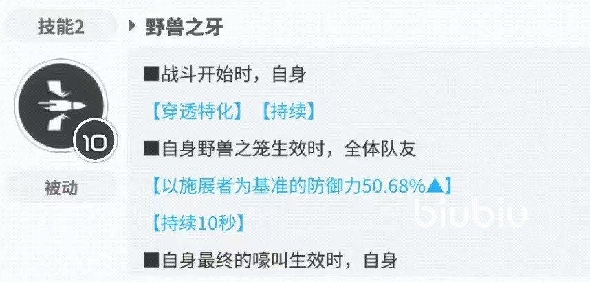 第2个被动技能野兽之牙,战斗开始时自身获得穿透特化,持续效果。在自身野兽之笼生效时,全体队友都能获得防御力提升效果,持续10秒钟。在自身最终嚎叫生效时,自身将获得恢复效果,持续10秒钟。自身发动大红狼时提高攻击力,持续10秒钟。这个被动其实是和自身的爆裂技能大红狼有着密切的联系,因为大红狼就是具有这三种效果。