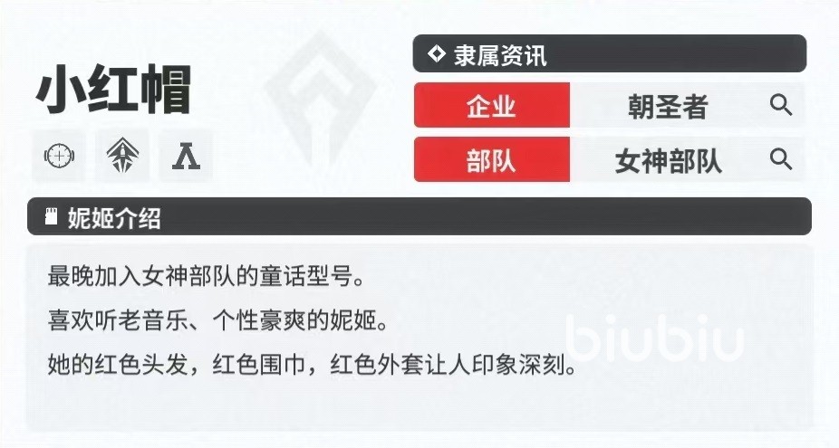 小红帽是属于朝圣者企业女神部队,是最晚加入女神部队的童话型号。它所使用的武器是狙击步枪,6发最大装弹数,两秒钟换弹时间,需要蓄力来打出最高伤害,全蓄力伤害时间为一秒钟,反应还是比较快的。自身属于铁甲代码,对于电击代码敌人有额外伤害。第1个被动怒目相视,在进行普通攻击时,自身可以提高蓄力速度,这个效果最多能叠加10次,持续5秒钟。在战斗开始时,如果自身蓄力速度超过100%,那么将超出值转化成蓄力伤害。