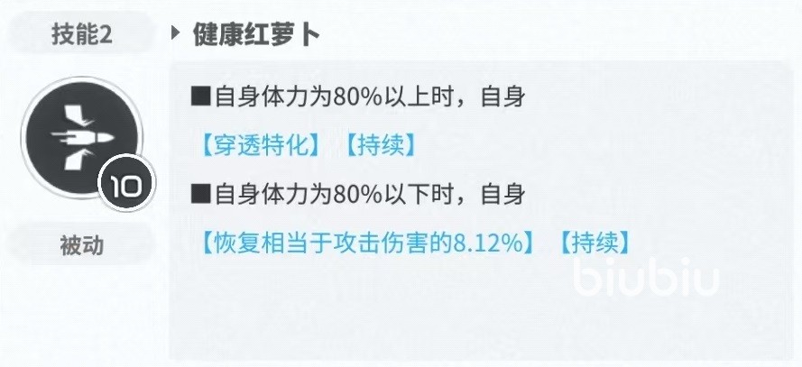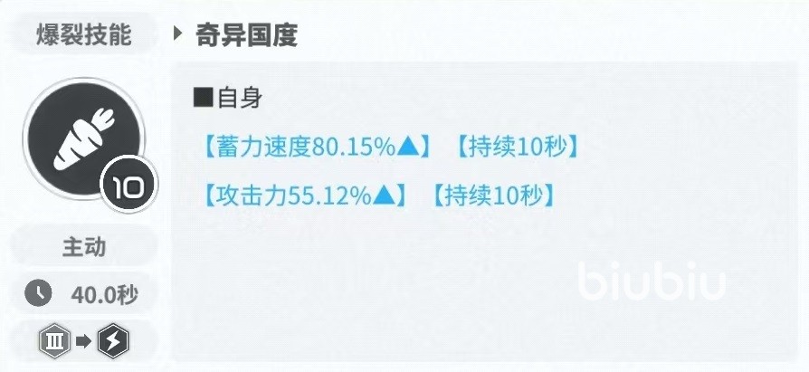 第2个被动技能健康胡萝卜,当爱丽丝自身体力为80%以上的时候,自身获得穿透特化,在自身体力降到80%以下的时候,自身获得恢复效果,这两项都是持续性的。爆裂技能奇异国度,自身提高蓄力速度,提高攻击力,持续10秒钟,提升的数值非常可观。爱丽丝之所以可以在很多场景中见到,是因为在故事主线和boss战中,都是非常不错的打手,这些技能效果是非常适合很多不同pve队伍搭配使用的,例如黑白兔队伍,皇冠队伍等。