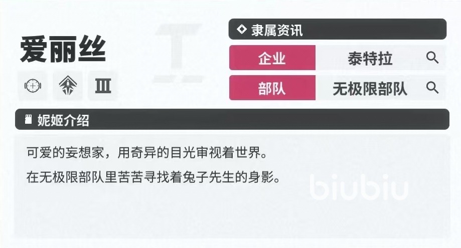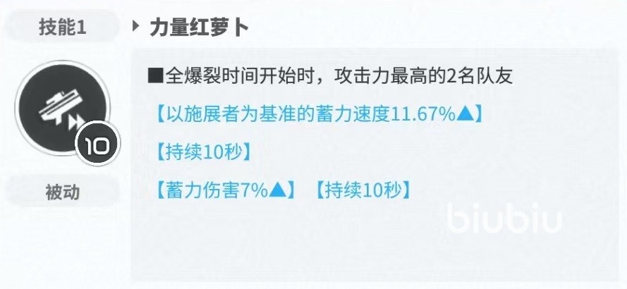 在游戏的很多战斗场景中,爱丽丝都会出现,它是属于泰特拉企业无极限部队,属于燃烧属性,对于风压敌人有额外伤害加成。使用的武器是狙击步枪,最大装弹6发,换弹时间两秒钟,操作类型为蓄力型,也就是需要蓄力之后才可以打出最高伤害,蓄力时间1.5秒为全蓄力伤害。第一个被动技能力量胡萝卜,在全爆裂时间开启时,会选择攻击力最高的两名队友提升其蓄力速度,提升蓄力伤害,持续10秒钟。