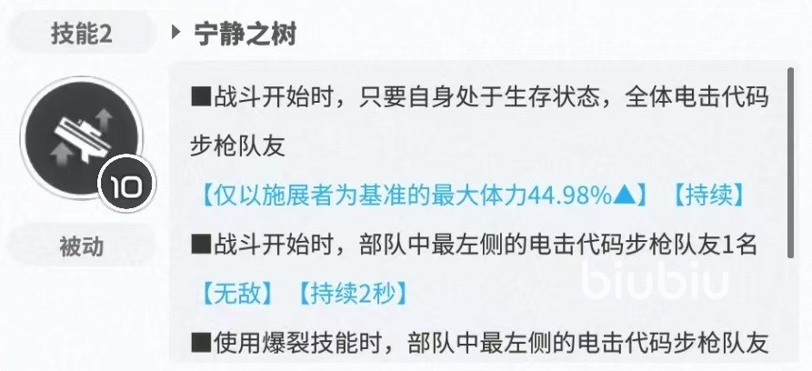 第2个被动技能宁静之树,在战斗开始时只要自身生存,那么全体电击代码步枪队友,都可以获得体力恢复。在战斗开始时,部队中最左侧电击代码的步枪队友,会获得持续两秒的无敌效果。在使用爆裂技能时,部队最左侧的电击代码步枪队友,获得伤害提升和换弹速度提升这两个效果,持续十秒。这对于特定位置的队友输出提升非常关键,所以大家在阵容搭配的时候一定要注意好位置,争取让主c吃满被动。