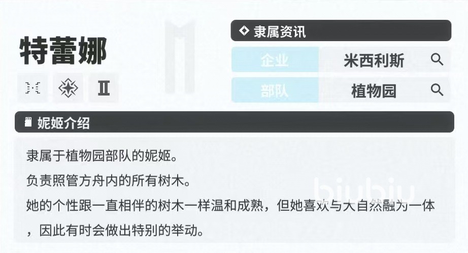 特蕾娜属于米西利斯企业,隶属于植物园部队,负责照管方舟内的所有树木,它的个性和树木一样温和成熟,喜欢和大自然融为一体。自身属于电击属性,能够对水冷敌人造成额外伤害。使用的武器是发射器,换弹时间2.52秒钟,最大装弹数6发,需要蓄力才能打出更高伤害。第1个是被动技能大自然的恩惠,在全爆裂时间结束时,全体队友将获得持续恢复效果,按照施法者最大体力百分比计算。在全蓄力攻击时,会选择剩余体力比例最低的两名队友进行恢复,队友体力百分比越低,恢复效果也就越好。