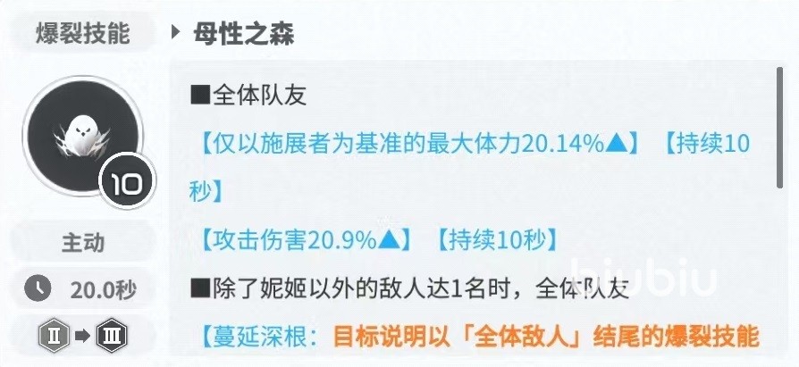 爆裂技能母性之森,对全体队友施展恢复体力和攻击伤害提升效果。英雄角色目前潜力非常大,不过依然有局限性,因为目前的电击步枪pve常用的只有红莲一个,所以在这种搭配方面并不算特别自由,不过配合红莲打出的清怪能力绝对是非常出色的。